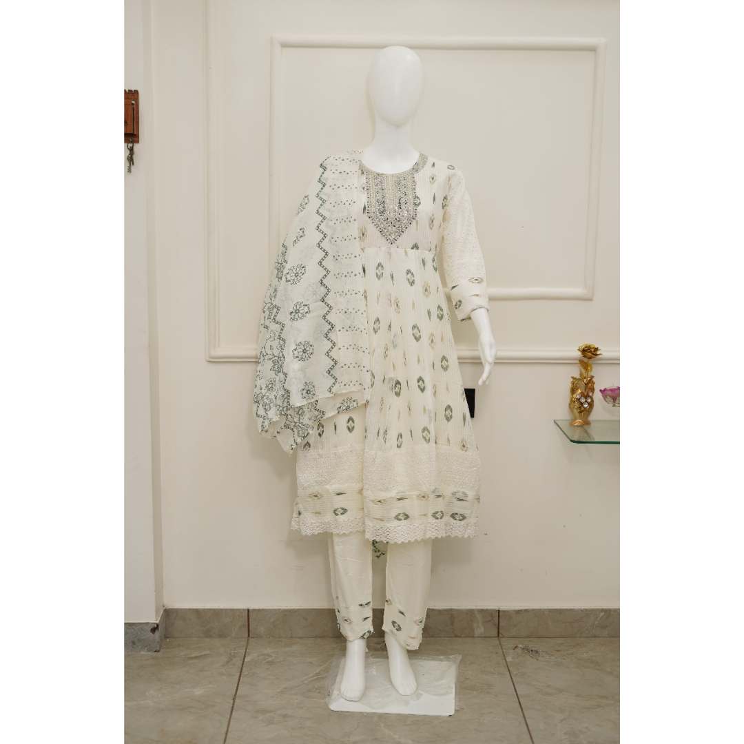 Elevate your ethnic wardrobe with this graceful 3-piece Kurti Pant Set in soothing white. Crafted from soft, breathable fabric with delicate green prints, it perfectly balances tradition with modern style.